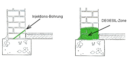 Das DEGESIL® ist sehr kapillaraktiv und verdrängt daher im Injektionsbereich das in den Baustoffporen vorhandene Wasser. Durch die nebeneinanderliegenden Bohrlöcher ergibt sich somit eine zusammenhängende, streifenartige Baustoffzone, deren Poren mit DEGESIL® gefüllt sind.