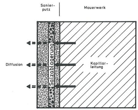 Der Auftrag eines Sanierputzes ist in erster Linie eine flankierende Maßnahme, weil zunächst die Wasserzufuhr ins Mauerwerk dauerhaft gestoppt werden muss. Sanierputze ersetzen keine Abdichtungsmaßnahmen.